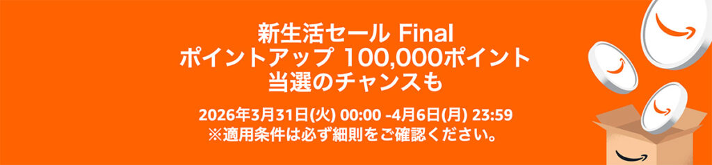 2026年3月31日(金)0時~4月6日(月)23時59分まで、Amazon新生活セールFinalが行われます!(3/31〜4/2は先行セール)